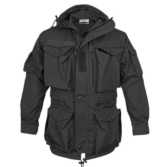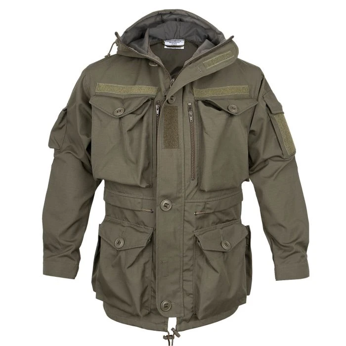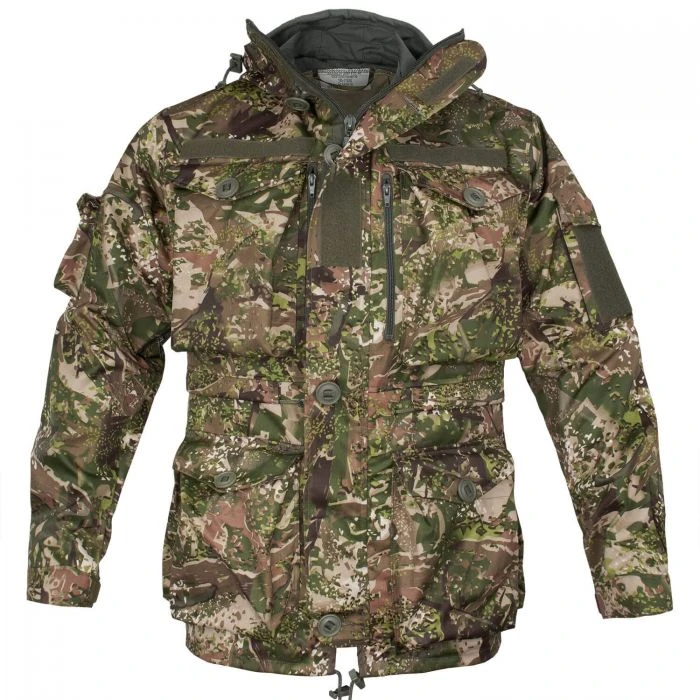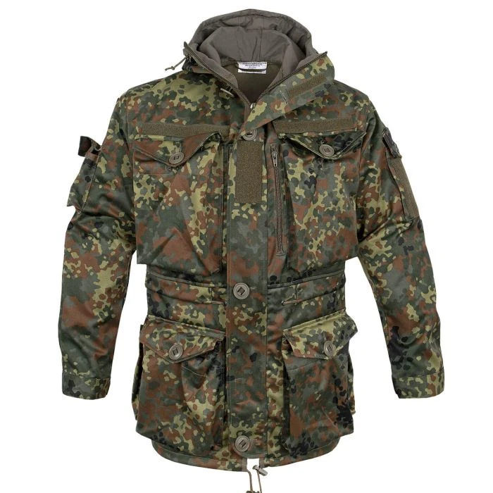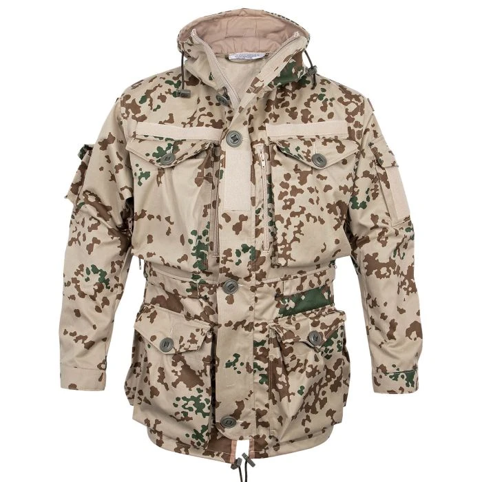Hervorragend funktionelle Einsatzkampfjacke, hergestellt nach Bundeswehr-TL. Gerader, bequemer Schnitt, durchgehender, hochschließender Zwei-Wege-Frontreißverschluss mit darüberliegender Knopfleiste, Tunnelzüge mit Kordelstoppern in Taille und Bundabschluss, vier geräumige Taschen mit bandgenähten Knöpfen auf der Front sowie zwei große, verdeckte Brusttaschen mit Reißverschluss. Ellenbogenverstärkungen aus Corduragewebe und mit herausnehmbarer Polsterung, Oberarmtaschen, langer Reißverschluss im Achselbereich wie auch durch Klett regulierbare Ärmelabschlüsse. Hoheitsabzeichen auf den Oberarmen. Seitlich zwei große Taschen mit Knopfverschluss sowie große Tasche im Gesäßbereich. Rückenschlaufen zum Anbringen von Tarnmaterial. Kapuze mit Tunnelzug und Kordelstopper sowie eingearbeitetem Drahtbügel zur Sichtfeldeinstellung/Regenschutz. Diverse Klettaufnahmen auf Brust und Oberarmen. Zwei reißverschließbare Innentaschen. Bei allen Knöpfen handelt es sich um bandgenähte, sogenannte Canadian-Style Slotted Buttons, welche ein Öffnen und Schließen der Taschen (auch mit Handschuhen) erleichtern.