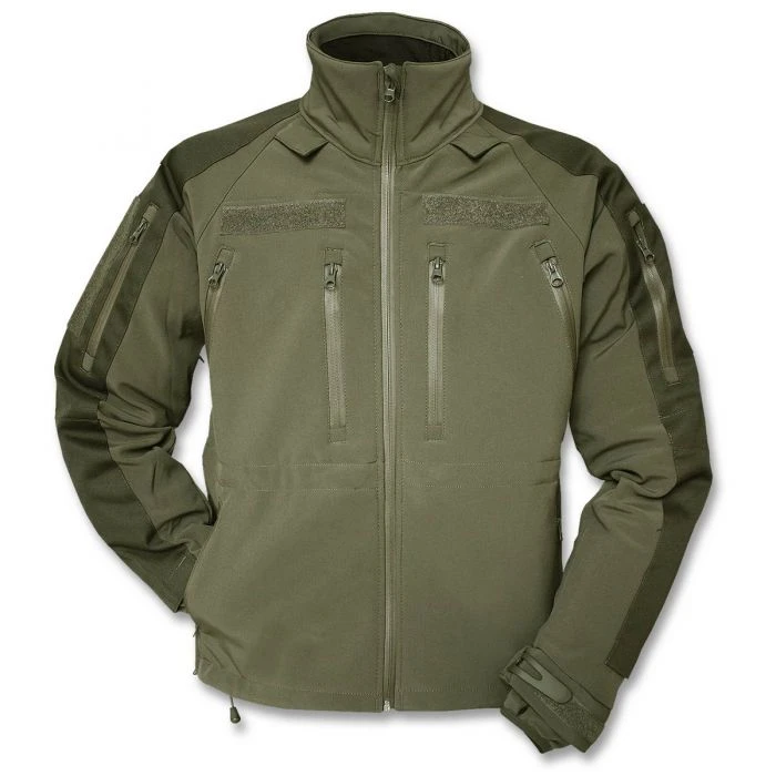Funktionale Softshell Jacke mit Frontreißverschluss mit hinterlegtem Windschutz und Kinnschutz. Vier Taschen im Brustbereich, davon zwei Vest-Style und zwei Reißverschluss-Eingriffstaschen bieten Stauraum. In den beiden Reißverschluss-Innentaschen können Wertsachen wie beispielsweise Handys verstaut werden. Die Ärmel sind verstärkt und zusätzlich mit je einer Klettaufnahme für Patches oder ähnliches versehen. Zudem sind die Ärmelbündchen mit Daumenschlaufe und Klettverschluss zur Weitenregulierung versehen. Die Ärmelverstärkung mit Klettverschluss ermöglicht es eine Schutzeinlage einzusetzen. Für mehr Bewegungsfreiheit sind zwei seitliche Reißverschlüsse angebracht, der Reißverschluss im Achselbereich sorgt für eine gute Belüftung des Fleece-Innenfutters. Am Rücken besteht die Möglichkeit Security-Patches an einem verdeckten Klettverschluss anzubringen, auf der Brust befinden sich ebenfalls zwei Klettannahmen. Der Taillen- und der Bundzug sind in der Weite regulierbar und alle angebrachten Reißverschlüsse sind wasserfest.