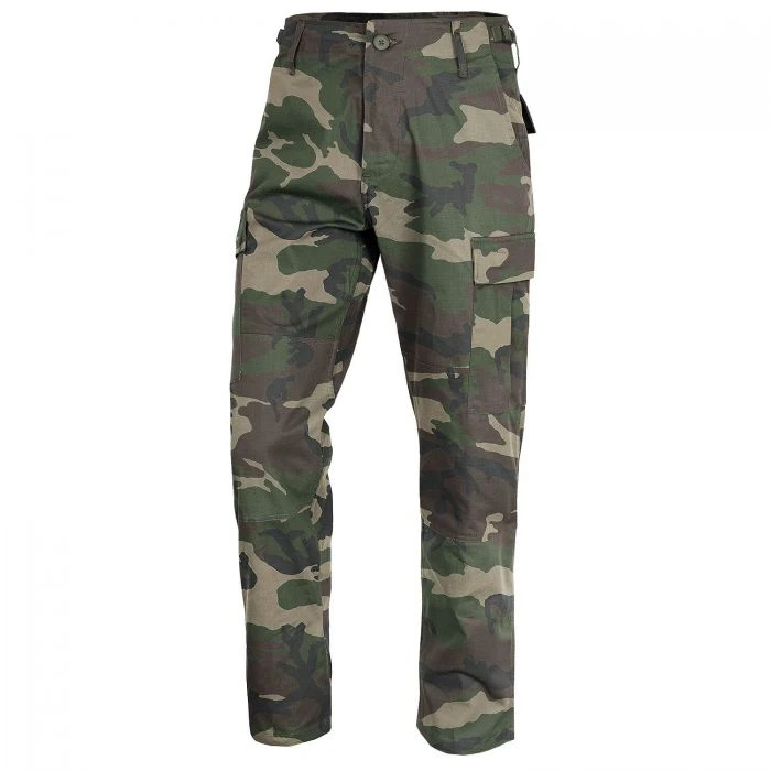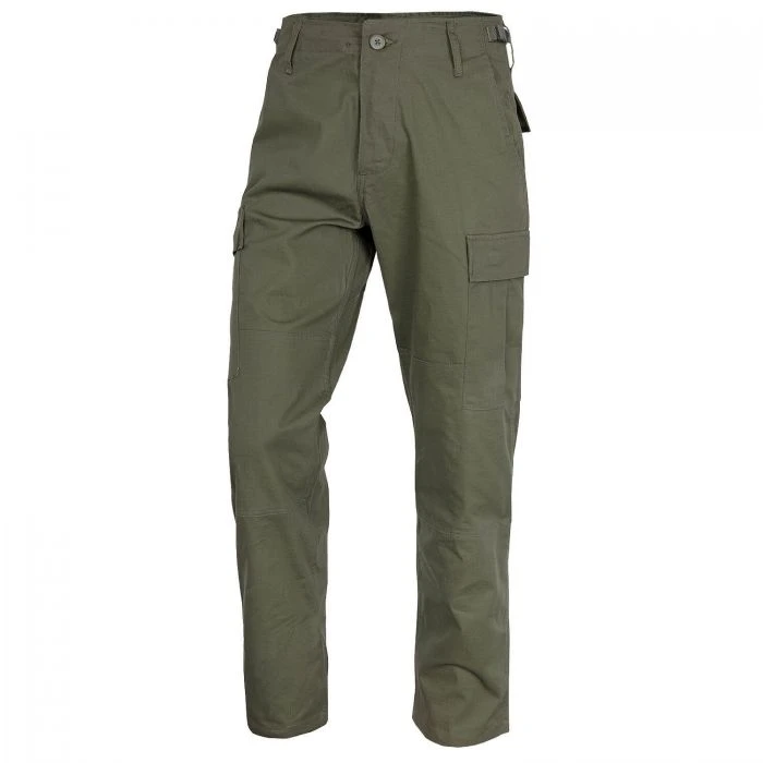 Die BDU Feldhose ist das Basismodel der US-Streitkräfte. Ein sehr guter Nachbau in vorgewaschener Qualität. Top Ausstattung und hoher Komfort, so zwei seitliche Einschubtaschen, zwei große, seitlich aufgesetzte Beintaschen, zwei Gesäßtaschen mit Patte und Knopfverschluss. Außerdem Gesäßverstärkung, Knieverstärkung, verstellbare Bundweite, 50mm Gürtelschlaufen sowie Eingriff mit verdeckter Knopfleiste. Der Beinabschluss kann durch ein eingearbeitetes Zugband reguliert werden. Ripstop-Gewebe ist in der Basis ein feines Gewebe und an der Rechenkästchenstruktur zu erkennen, alle paar Millimeter zieht sich ein kräftigerer Kett- bzw. Schussfaden durch das Gewebe. Sollte das Material reißen, läuft der Riss nicht ungebremst durch die gesamte Fläche, sondern stoppt am stärkeren Rip Stop-Faden.