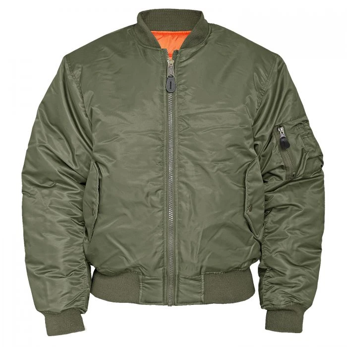 Der Klassiker schlechthin! In preiswerter Variante präsentiert sich die MA1® mit einem stabilen Frontreißverschluss aus Kunststoff, zwei seitlichen Einschubtaschen mit Patte und Druckknopf und zwei Innentaschen. Weiterhin eine aufgesetzte Oberarmtasche mit Reißverschluss und Armbüro, dem typischen Strickbund an Kragen, Ärmeln und Saum. Unverkennbar ist der orange farbige Innenstoff, welcher die Bomberjacke zur Wendejacke werden lässt, indem man Orange einfach nach außen trägt. Die Pilotenjacke ist ein absolutes Must-Have in deinem Kleiderschrank!